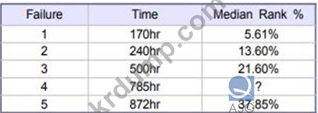 12개의 펌프에 대한 신뢰성 테스트는 1000시간에 종료됩니다. 다음과 같이 5번의 실패가 있었습니다. 4번째 실패에 대한 중간 순위 %는 얼마입니까?