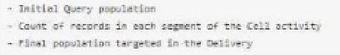 회사에는 셀 활동에 정의된 20개의 서로 다른 세그먼트가 있는 캠페인 워크플로우가 있습니다. 워크플로가 배달 활동에 도달하면 요구 사항은 다음을 포함하는 개수를 제공하는 것입니다.