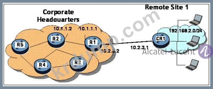 네트워크 다이어그램(Exhibit 버튼 클릭)을 기반으로 R1에 대한 기본 고정 경로를 설정하기 위해 CR1에서 사용되는 접두사, 마스크 및 다음 홉은 무엇입니까?