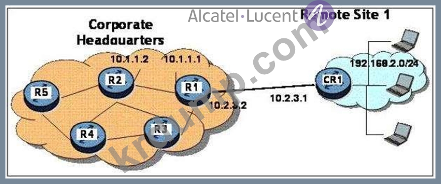 네트워크 다이어그램(Exhibit 버튼 클릭)을 기반으로 R1에 대한 기본 고정 경로를 설정하기 위해 CR1에서 사용되는 접두사, 마스크 및 다음 홉은 무엇입니까?