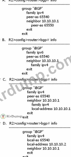 Consider two Alcatel-Lucent 7750 SRs in AS 65540. Router R1 has system address 10.10.10.1, and router R2 has