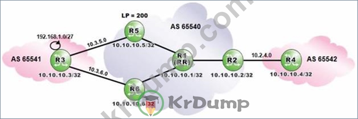 200. Router R3 advertises the prefix 192.168.1.0/27 to routers R5 and R6. Assuming that router R6 is configured with