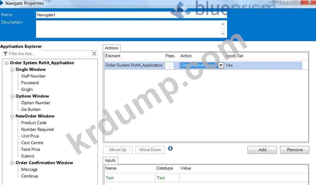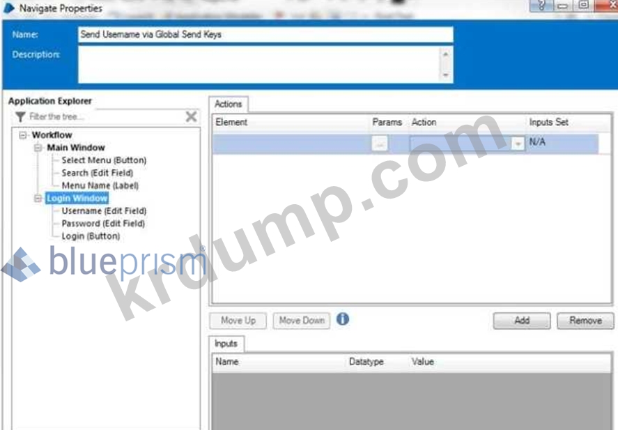 비즈니스 개체는 글로벌 전송 키 단계를 사용하여 워크플로라는 애플리케이션의 사용자 이름 필드를 채워야 합니다. 응용 프로그램에 포커스가 있고 커서가 사용자 이름 필드에 있습니다. Global Send Keys를 구성하려면 아래 단계의 Element 필드에 어떤 요소를 배치해야 합니까?