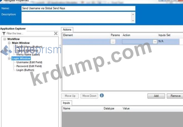 비즈니스 개체는 글로벌 전송 키 단계를 사용하여 워크플로라는 애플리케이션의 사용자 이름 필드를 채워야 합니다. 응용 프로그램에 포커스가 있고 커서가 사용자 이름 필드에 있습니다. Global Send Keys를 구성하려면 아래 단계의 Element 필드에 어떤 요소를 배치해야 합니까?