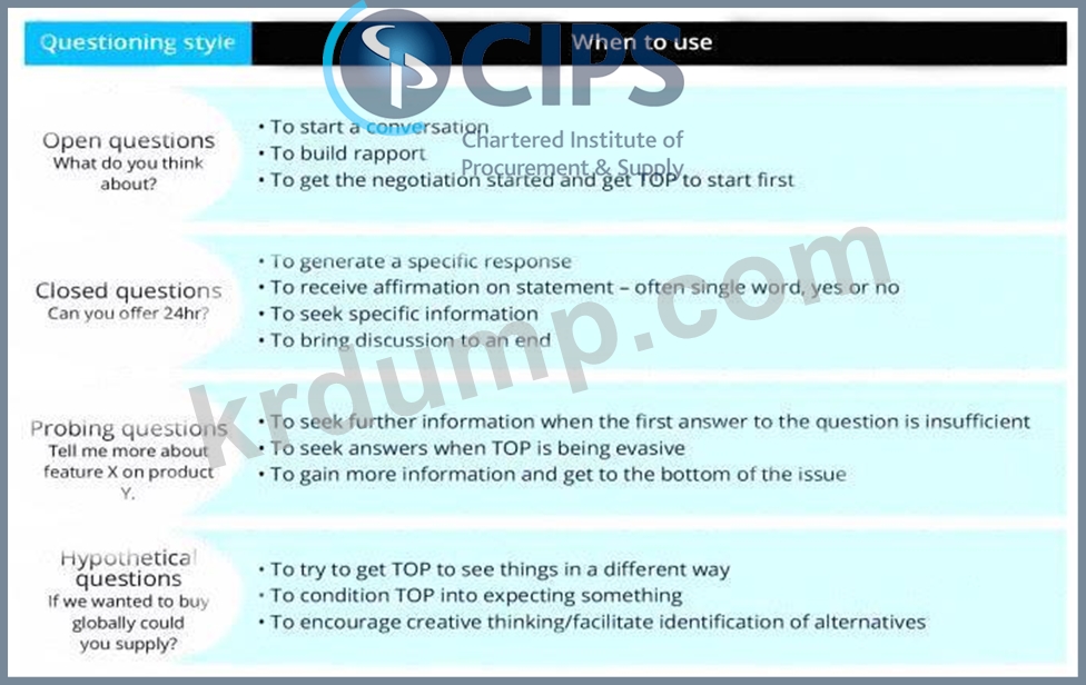 설명 상업적 협상에서 사용할 수 있는 질문에는 네 가지 유형이 있습니다. 가능한 상황이나 추상적 개념에 대해 묻는 가상의 질문은 테스트 및 제안 단계에서 매우 유용합니다. 가상의 질문은 '만약 무슨 일이 일어나면 ...'에 관한 것이기 때문에 어떤 약속도 명시하지 않습니다. 이러한 유형의 질문은 제안할 때 유용할 수 있습니다. 자동으로 생성된 텍스트 설명 LO 3, AC 3.3