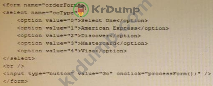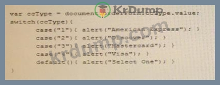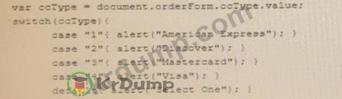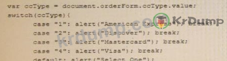 Ginger needs to write a script to display a pop-up alert box with the type of credit card the user selected Which of the following code blocks should she use?