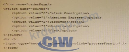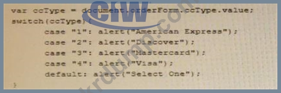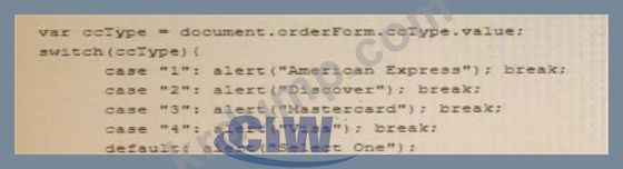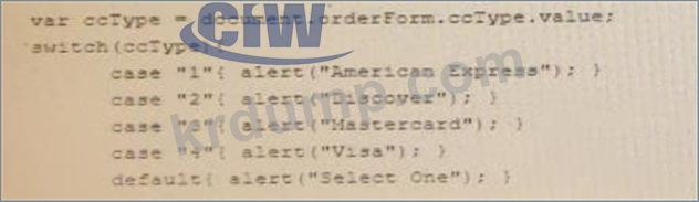 Ginger는 사용자가 선택한 신용 카드 유형과 함께 팝업 경고 상자를 표시하는 스크립트를 작성해야 합니다. 다음 중 그녀가 사용해야 하는 코드 블록은?