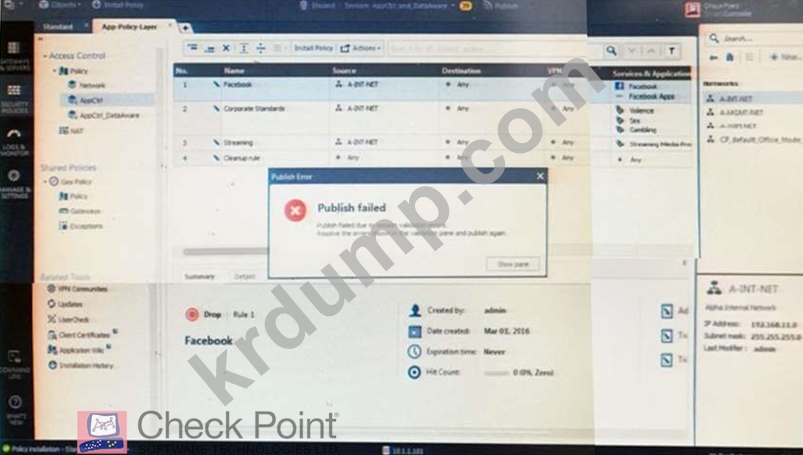 관리자 Kofi는 관리 서버에서 일부 변경을 수행한 다음 SmartConsole에서 게시 버튼을 클릭했지만 아래 스크린샷과 같은 오류 메시지가 나타납니다.