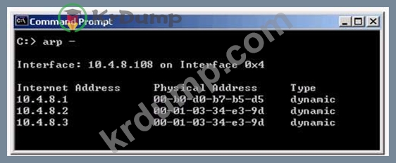 In a Load Sharing Unicast mode scenario, the internal-cluster IP address is 10.4.8.3. The internal interfaces on two members are 10.4.8.1 and 10.4.8.2. Internal host 10.4.8.108 Pings 10.4.8.3, and receives replies. The following is the ARP table from the internal Windows host 10.4.8.108: c:> arp -: