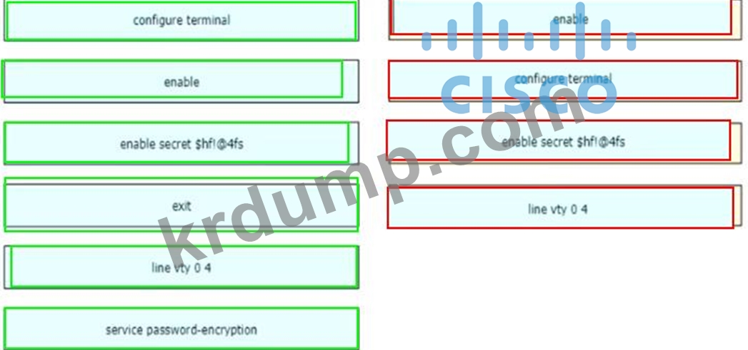 엔지니어가 로컬 사용자 데이터베이스가 이미 구성된 라우터에서 활성화 명령에 대해 암호화된 암호를 구성하고 있습니다. 왼쪽에서 오른쪽의 올바른 순서로 구성 명령을 끌어다 놓습니다. 모든 명령이 사용되는 것은 아닙니다.