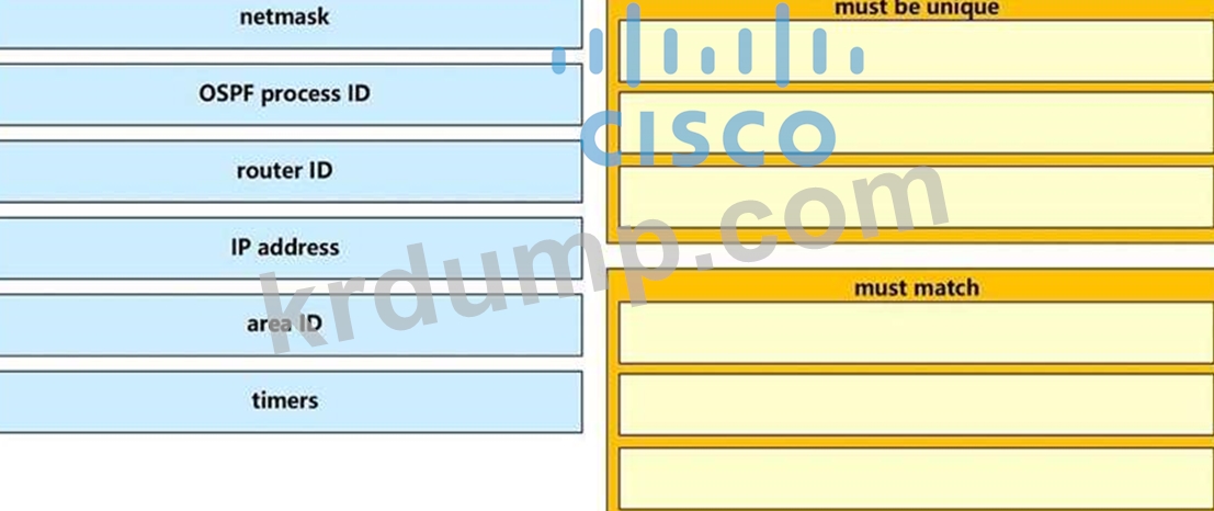 네트워크 엔지니어가 OSPFv2 인접 인접성을 구성하고 있습니다. 왼쪽에서 매개변수를 오른쪽의 필수 범주로 끌어다 놓습니다. 모든 매개변수가 사용되지 않습니다.