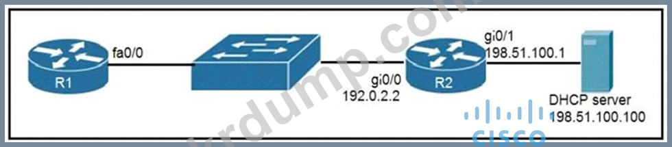 엔지니어는 R1이 DHCP에서 IP 구성을 가져오는 토폴로지를 배포합니다. 스위치 및 DHCP 서버 구성이 완전하고 올바른지 여부. 작업을 완료하기 위해 R1과 R2에서 구성해야 하는 두 가지 명령 집합은 무엇입니까? (2개 선택)