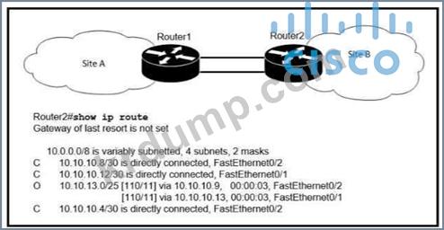 전시회를 참조하십시오. OSPF가 이 네트워크에서 실행 중인 경우 라우터 2는 사이트 B에서 사이트 A의 10.10.13/25로 가는 트래픽을 어떻게 처리합니까?