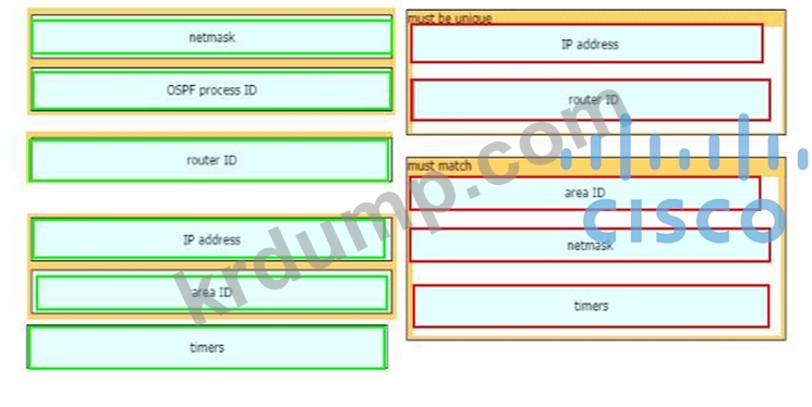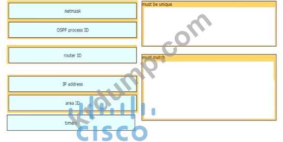 네트워크 엔지니어가 OSPFv2 이웃 인접성을 구성하고 있습니다. 매개변수를 왼쪽에서 오른쪽의 필수 범주로 끌어다 놓습니다. 모든 매개변수가 사용되는 것은 아닙니다.