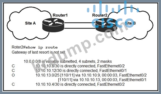그림을 참조하세요. 이 네트워크에서 OSPF가 실행 중이라면, Router2는 사이트 B에서 사이트 A의 10.10.13.128/25로 향하는 트래픽을 어떻게 처리합니까?