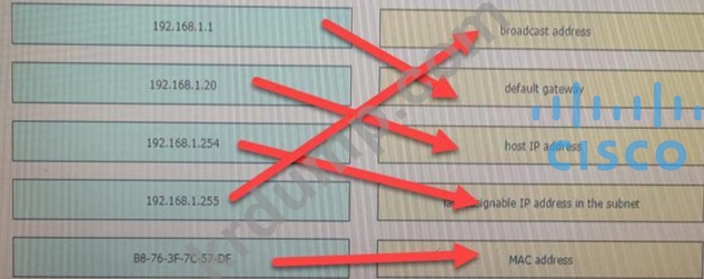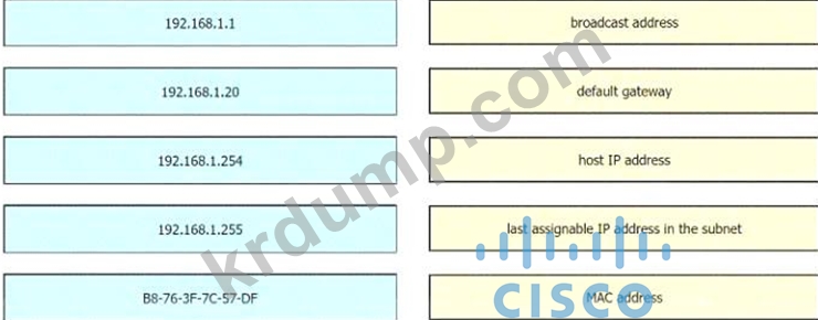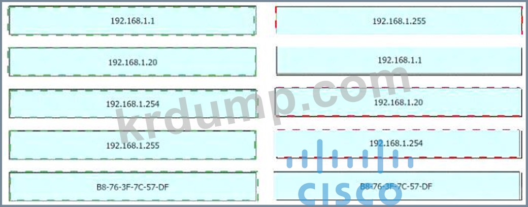 엔지니어는 클라이언트 워크스테이션에서 네트워크 구성 매개변수를 검증하여 팀장에게 보고해야 합니다. 왼쪽의 노드 식별자를 오른쪽의 네트워크 매개변수로 끌어다 놓으세요.