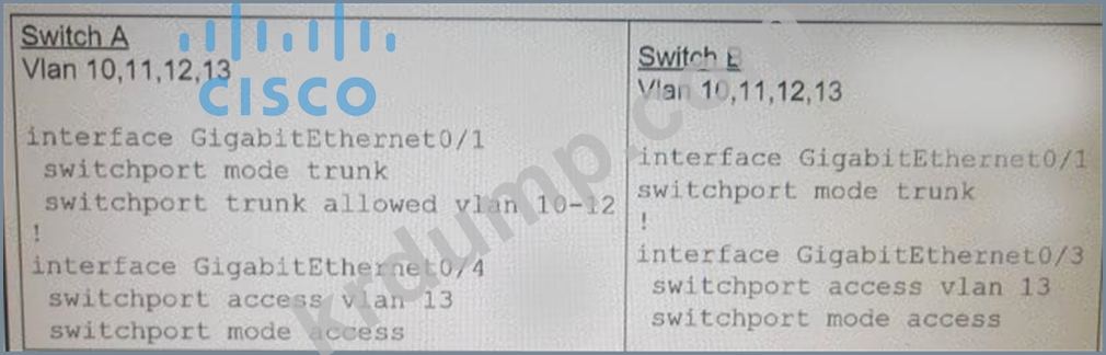 스위치 A와 스위치 B는 VLAN 10, 11, 12, 13으로 부분적으로 구성되었습니다. 구성의 다음 단계는 무엇입니까?