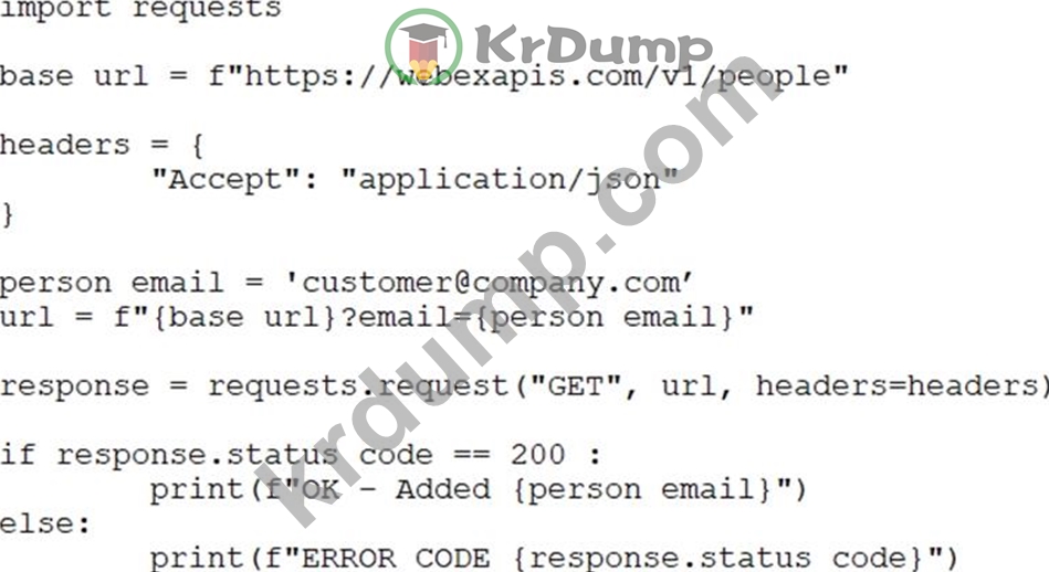 A collaboration engineer has developed a script to automate the gathering of information by providing the email address of the individual. When the engineer tests the script, a 401 error is received. Which command fixes the script?