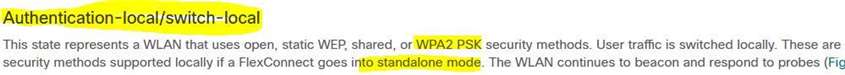 지점 무선 사용자는 더 이상 본사에서 서비스에 액세스할 수 없지만 사이트에서 로컬로 서비스에 액세스할 수 있다고 보고합니다. 새로운 무선 사용자는 WAN이 다운된 동안 무선에 연결할 수 있습니다. 이 시나리오에서 볼 수 있는 세 가지 요소(Cisco FlexConnect 상태, 작동 모드 및 인증 방법)는 무엇입니까?