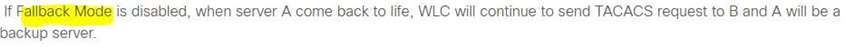엔지니어는 두 개의 TACACS+ 서버로 Cisco AireOS 컨트롤러를 구성했습니다. 엔지니어는 기본 TACACS+ 서버에 오류가 발생하면 WLC가 예상대로 보조 서버를 사용하기 시작하지만 WLC는 보조 서버에 오류가 발생하거나 컨트롤러가 재부팅될 때까지 기본 서버를 다시 사용하지 않는다는 것을 알게 됩니다. 이 문제의 원인은 무엇입니까?