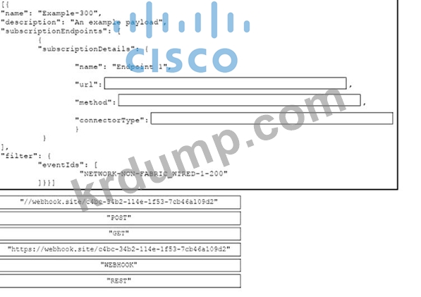 인텐트 API를 사용하여 Cisco DNA 이벤트를 구독하려면 코드 스니퍼를 맨 아래에서 코드의 공백으로 끌어다 놓습니다. 모든 옵션이 사용되는 것은 아닙니다.