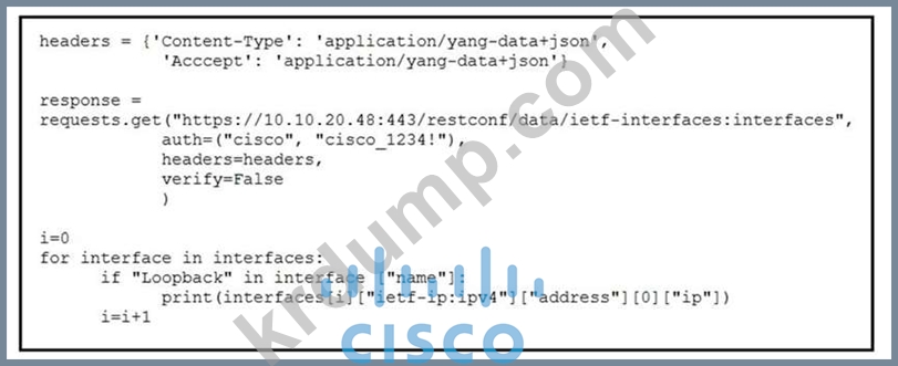 Python 스크립트는 Cisco IOS XE 장치를 구성하는 데 사용됩니다. 모든 루프백 인터페이스의 IP 주소를 인쇄하려면 스크립트를 업데이트해야 합니다. 루프 앞에 어떤 문장을 추가해야 할까요?