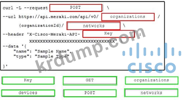 새로운 Cisco Meraki 조직을 위한 네트워크를 생성하려면 하단의 코드 조각을 코드의 공백으로 끌어다 놓습니다. 모든 옵션이 사용되지 않습니까?