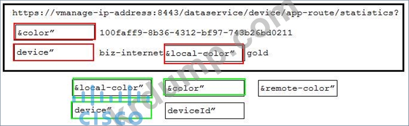 아래에서 코드를 누락된 상자로 끌어다 놓아 Cisco SD-WAN vManage Statistics API에 대한 이 API 요청을 완료합니다. 이 API는 ID가 100faff9-8b36-4312-bf97-743b26bd0211, a biz-internet의 로컬 색상과 금색의 원격 색상. 모든 옵션이 사용되는 것은 아닙니다.