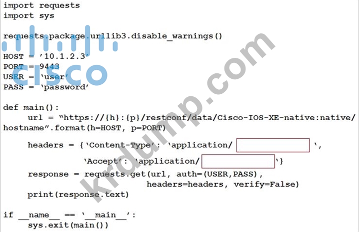 엔지니어는 RESTCONF를 사용하여 호스트 이름 정보를 표시하는 Python 스크립트를 만듭니다. 테스트할 수 있도록 코드를 완료해야 합니다. 전시회에서 강조 표시된 부분을 완성하는 문자열은 무엇입니까?