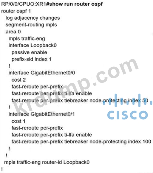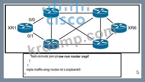 전시품을 참고하세요. 네트워크 내부의 모든 링크는 완전히 통합된 OSPF 도메인 내부의 기본 비용으로 구성됩니다. XR1의 구성이 주어지면 XR6의 루프백 인터페이스로 향하는 XR1의 트래픽이 기존 인터페이스에 대해 선택하는 인터페이스는 무엇입니까?