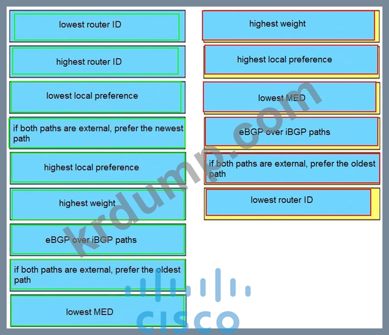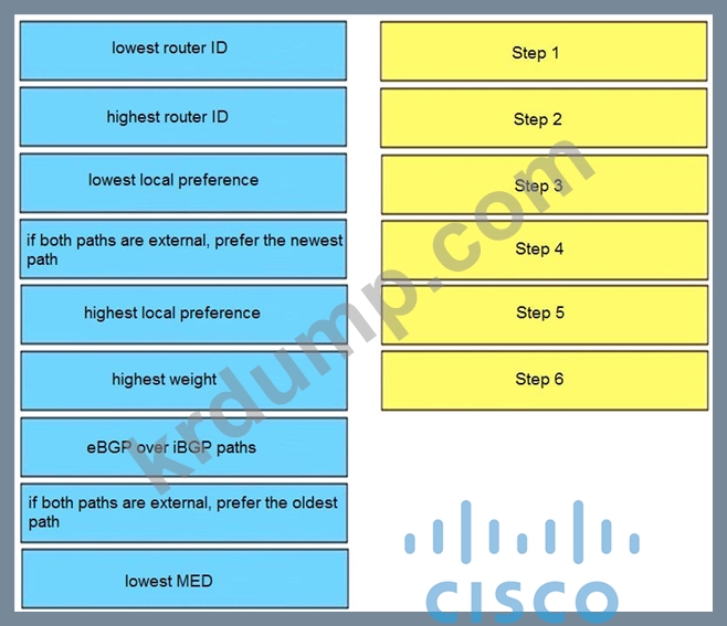 왼쪽의 BGP 경로 선택에 대한 속성을 오른쪽의 올바른 순서로 끌어다 놓습니다. 모든 옵션이 사용되는 것은 아닙니다.
