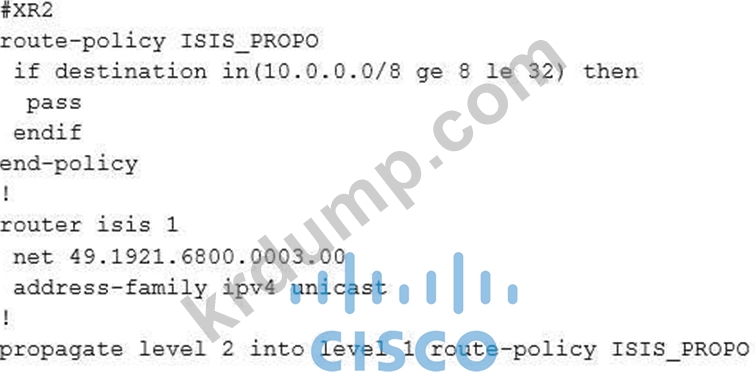 전시를 참고하세요. 네트워크 운영자는 XR2(10.16.16.0/24)의 레벨 1 경로를 ISIS 토폴로지에 삽입해야 합니다. XR3 및 XR1이 10.16.16.0/24에 대해 유효하고 작동하는 경로를 갖는 방식으로 주입을 허용하는 구성은 무엇입니까?