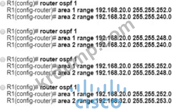 엔지니어는 범람을 중지하기 위해 영역 1의 4개 네트워크(192.168.20.0/24~192.168.23.0/24)와 영역 2의 8개 네트워크(192.168.32.0/24~192.168.39.0/24)에 대해 R1에 요약 구성을 적용했습니다. 모든 고객 경로의. R2의 라우팅 테이블을 확인하는 동안 엔지니어는 R1이 여전히 R2에 특정 경로만 보내고 있음을 발견했습니다. 엔지니어는 경로를 요약하기 위해 R1에 어떤 구성을 적용해야 합니까?