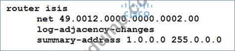 그림을 참조하십시오. 네트워크 엔지니어가 R1에 모든 ISIS 경로를 요약하는 구성을 적용했지만, R2는 여전히 R1에서 특정 경로를 수신하고 있습니다. 엔지니어는 두 라우터 모두 올바른 요약 구성으로 구성되었지만, R1이 올바른 요약 경로를 전송하지 않는다는 것을 확인했습니다. 레벨 1 내 경로를 요약하려면 라우터 R1에 어떤 구성을 적용해야 합니까?