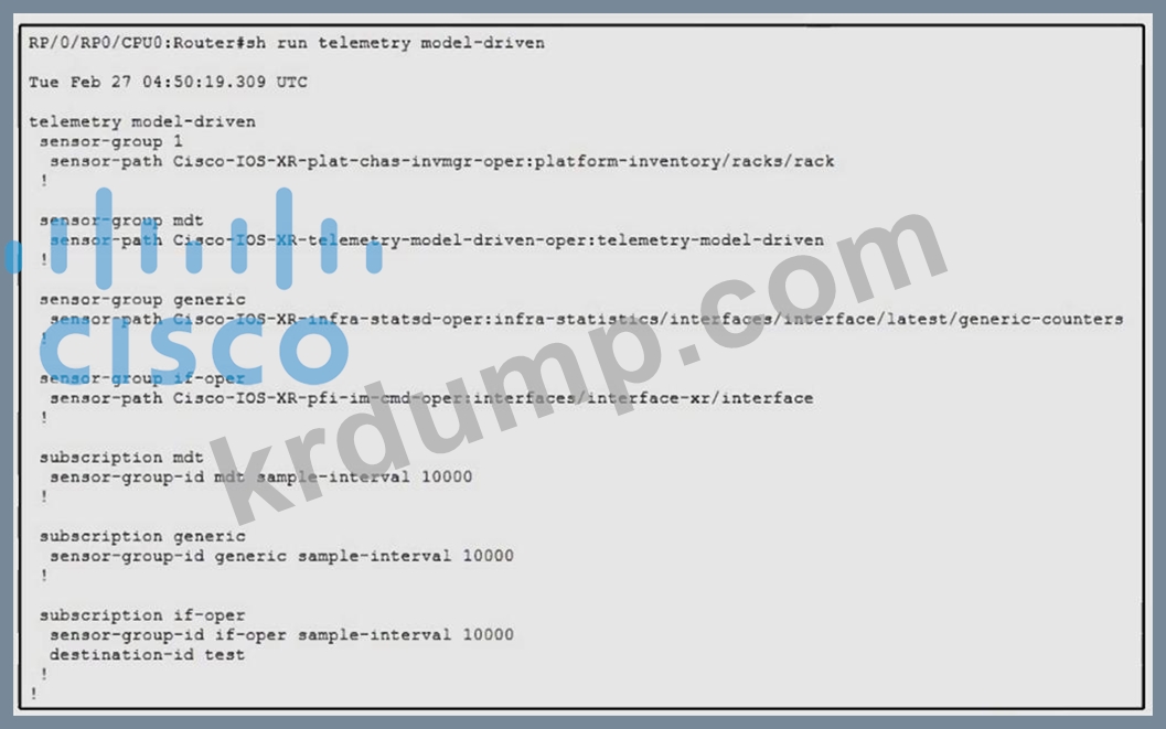 그림을 참조하세요. 엔지니어가 원격 측정 데이터를 사용하여 네트워크 장치에서 모니터링 정보를 수집하고 있습니다. 테스트 중에는 구성이 문제없이 작동했습니다. 실제 환경에 적용했을 때 다이얼 아웃 원격 측정 스트림이 전송되지 않습니다. 원격 측정 스트림 다이얼 아웃을 위해 Cisco IOS XR 라우터를 구성하는 데 누락된 단계는 무엇입니까?