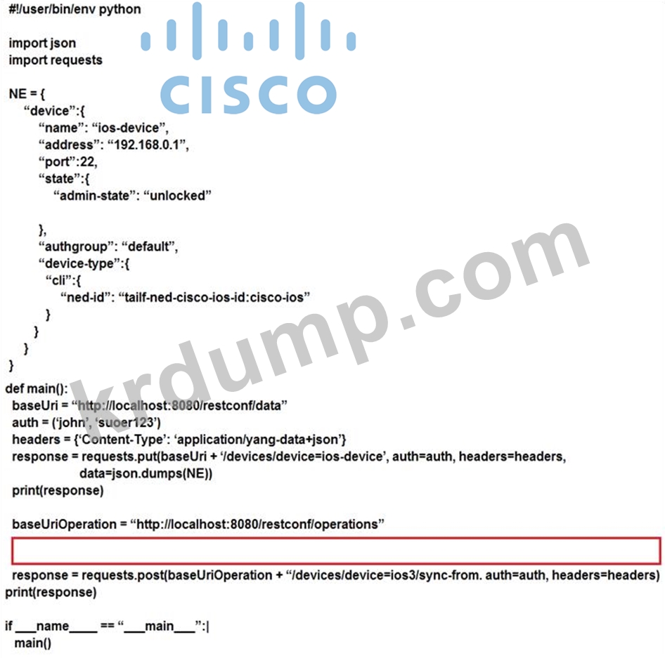 RESTCONF API를 사용하여 Cisco NSO에 새 장치를 추가하는 Python 스크립트를 작성했습니다. 장치는 성공적으로 추가되었지만, SSH 키를 가져오는 줄이 실행되는 동안 405 "Method Not Allowed RESTCONF" 오류 코드가 발생했습니다. 스크립트를 완성하는 데 필요한 코드는 무엇입니까?