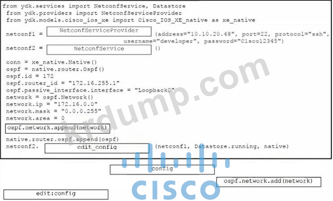 YDK와 NETCONF를 사용하여 Python 스크립트를 구성하려면 하단의 코드 조각을 코드 상자로 끌어다 놓으세요. 모든 옵션이 사용되는 것은 아닙니다.