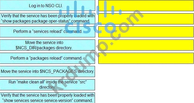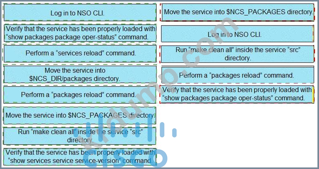 왼쪽의 단계를 오른쪽의 올바른 순서로 끌어다 놓아 이미 생성된 서비스를 NSO에 배포하세요. 모든 옵션이 사용되는 것은 아닙니다.