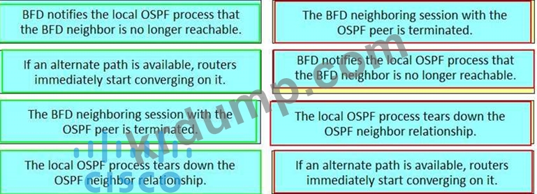 두 BFD와 OSPF 이웃 간의 네트워크에서 장애가 발생합니다. 프로토콜 작업을 왼쪽에서 오른쪽의 올바른 순서로 끌어다 놓습니다.