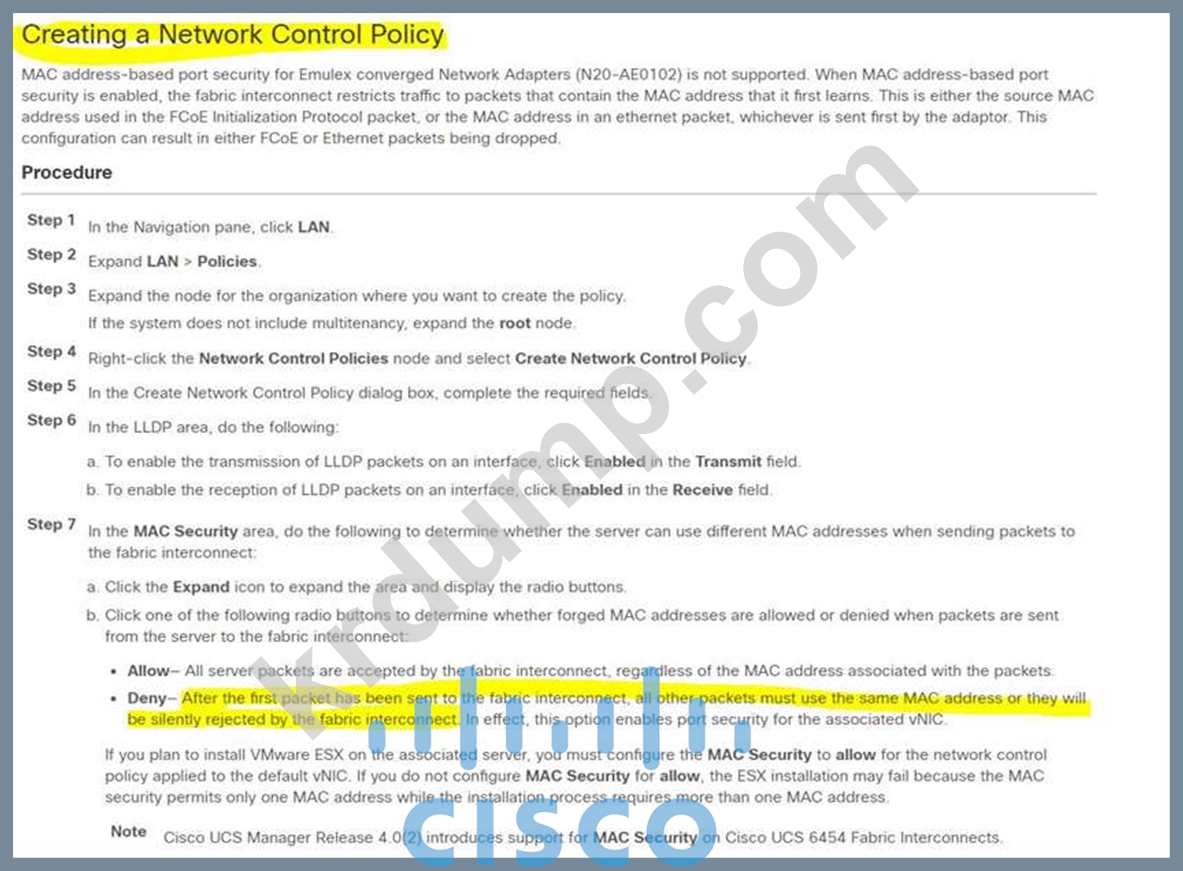 한 회사에 수백 개의 Cisco UCS 블레이드 섀시가 있는 여러 데이터 센터가 있습니다. 네트워크 컨설턴트는 레이어 1 문제 해결을 용이하게 하기 위해 서버에 대해 Cisco Discovery Protocol을 활성화할 계획입니다. 보안상의 이유로 회사는 첫 번째 패킷의 MAC 주소를 학습한 후 서버가 패브릭 인터커넥트에 다른 MAC 주소를 보내지 못하도록 제한하려고 합니다. 이 디자인을 지원하기 위해 수정해야 할 두 가지 정책은 무엇입니까? (두 가지를 선택하세요.)