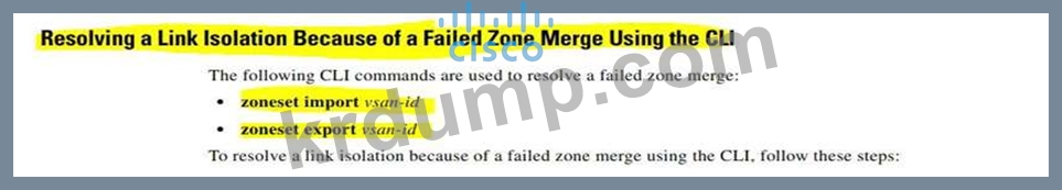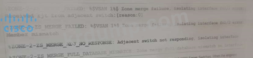 엔지니어는 2개의 상호 연결된 Cisco MDS 9000 시리즈 스위치를 사용하여 SAN 환경을 배포합니다. 엔지니어가 영역 병합을 시도하면 전시회에 표시된 오류와 함께 실패합니다. 어떤 조치가 문제를 해결합니까?