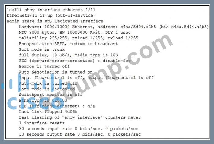 엔지니어가 ACI에 대한 상태 확인을 수행하고 있습니다. 인터페이스 이더넷 1/11에 대한 설명으로 옳은 것은?