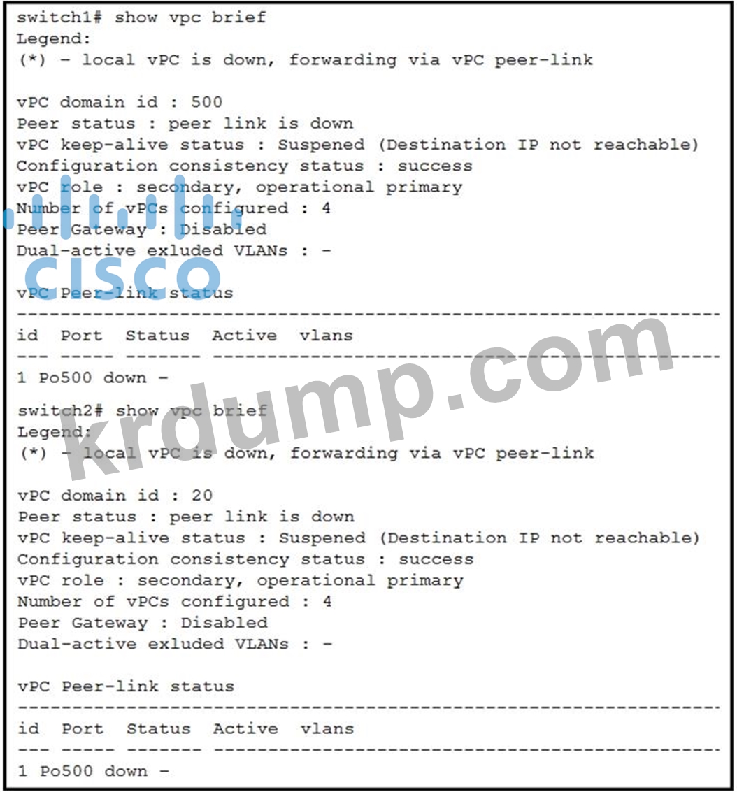 switch1과 switch2 사이의 vPC가 작동하지 않습니다. 문제를 해결하려면 어떤 두 가지 조치가 필요합니까? (2개를 선택하세요.)