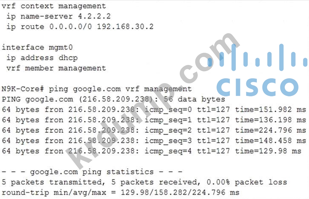 네트워크 엔지니어는 스위치에서 실행되는 게스트 셸이 Python 패키지를 다운로드할 수 있도록 DHCP를 사용하여 Nexus 스위치 관리 포트를 인터넷에 연결했습니다. 엔지니어는 Nexus 스위치에서 google.com을 성공적으로 ping할 수 있지만 게스트 셸은 Python 패키지를 다운로드하지 못했습니다. 어떤 조치가 문제를 해결합니까?