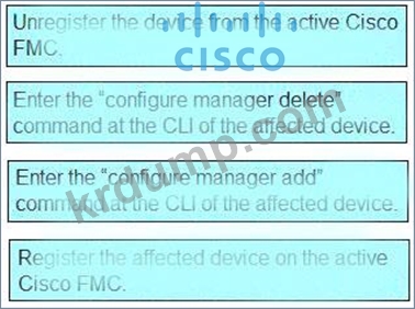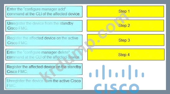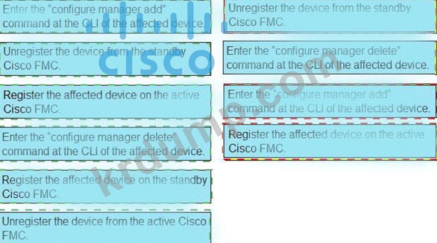 대기 Cisco FMC에서 자동 장치 등록 실패를 복원하는 단계를 왼쪽에서 오른쪽의 올바른 순서로 끌어다 놓습니다. 모든 옵션이 사용되는 것은 아닙니다.