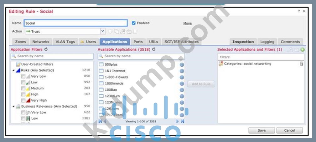 조직에 검사를 위해 모든 소셜 미디어 트래픽을 보낼 의도로 액세스 제어 규칙이 있습니다. 일정 기간 동안 규칙을 사용한 후 관리자는 트래픽이 검사되지 않았지만 자동으로 허용되고 있음을 알게 되었습니다. 이 문제를 해결하기 위해 수행해야 하는 작업 ?