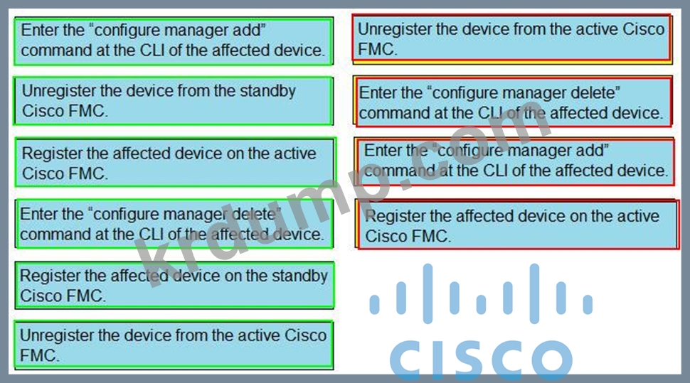 대기 Cisco FMC에서 자동 장치 등록 실패를 복원하는 단계를 왼쪽에서 오른쪽의 올바른 순서로 끌어다 놓습니다. 모든 옵션이 사용되는 것은 아닙니다.