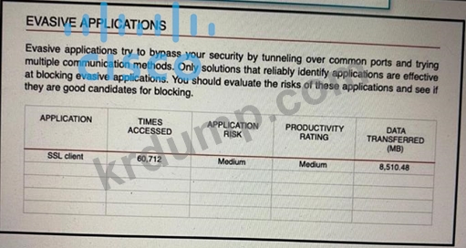 관리자는 Cisco Firepower의 보고 기능 중 일부를 살펴보고 있으며 네트워크 위험 보고서의 이 섹션에서 클라우드가 회피에 사용되는 많은 SSL 활동을 보여주고 있음을 확인했습니다. 이 위험을 완화할 조치는 무엇입니까?