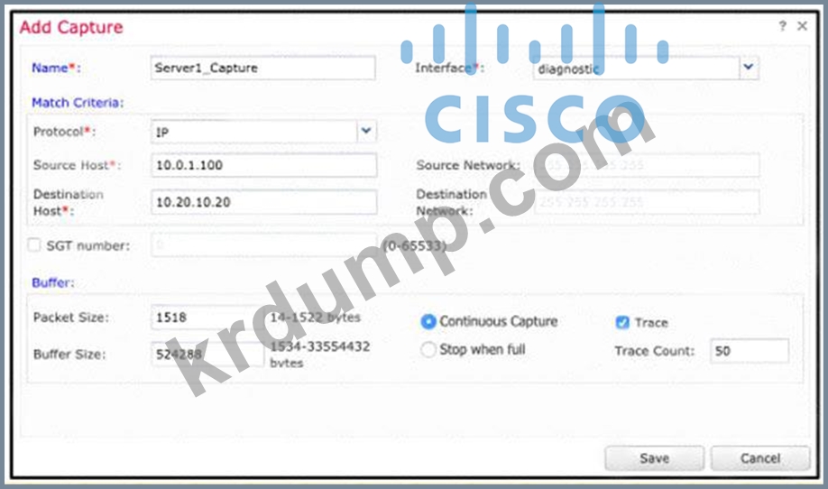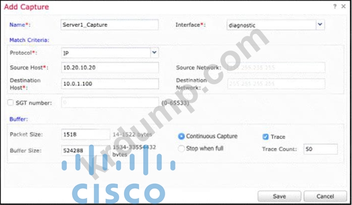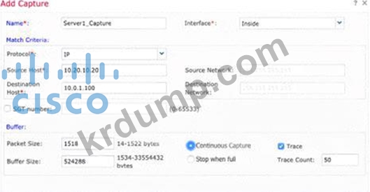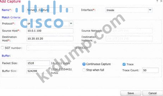 엔지니어가 웹 서버에 연결할 수 없는 장치의 문제를 해결하고 있습니다. 연결은 Cisco FTD 내부 인터페이스에서 시작되고 9443의 비표준 포트를 통해 10.0.1.100에 도달하려고 시도합니다. 엔지니어가 연결을 시도하는 호스트는 10.20.10.20의 IP 주소에 있습니다. 네트워크의 패킷에 어떤 일이 발생하는지 확인하기 위해 엔지니어는 FTD 패킷 캡처 도구를 사용하기로 결정합니다. 이 문제를 해결하는 데 필요한 정보를 수집하는 데 어떤 캡처 구성을 사용해야 합니까?