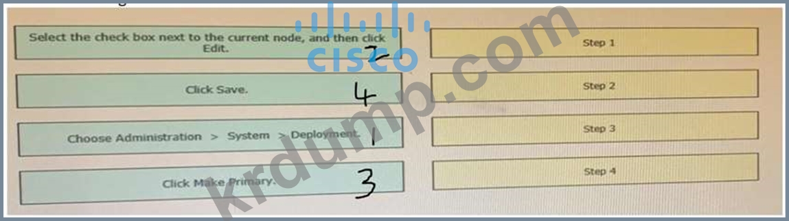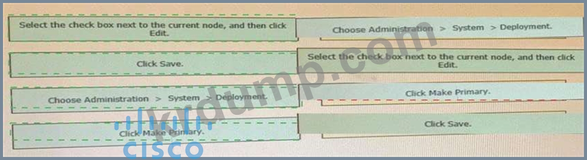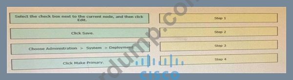 Cisco ISE 노드를 기본 관리 노드로 구성하는 단계를 왼쪽에서 밤에 올바른 순서로 끕니다.